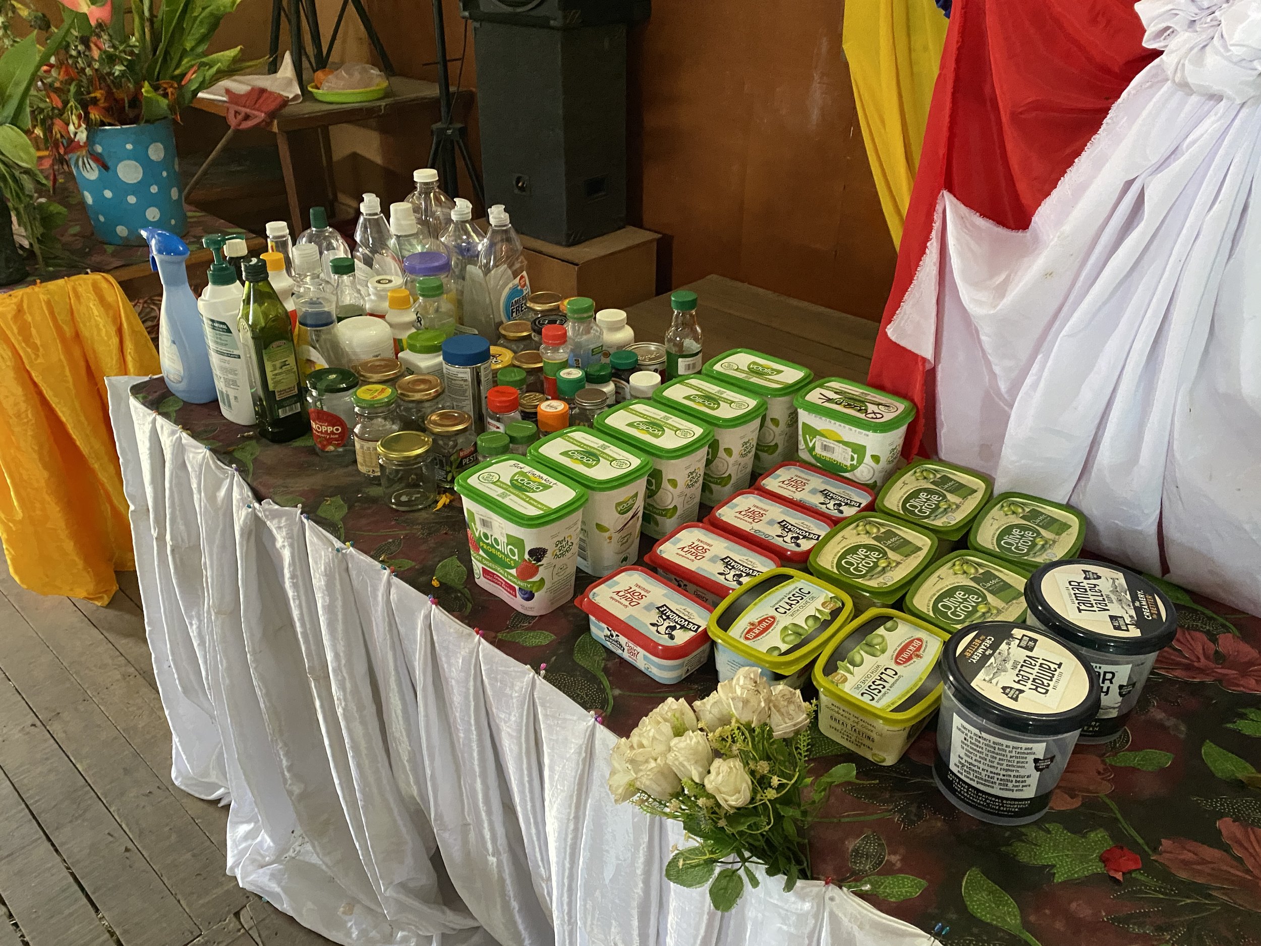 They are so grateful for me giving them my “trash”, which is really humbling. They tell me they use the large bottles to put water in when they are walking to their gardens in the bush, which can be up a day’s walk. The margarine tubs get used to store sugar or salt, to keep ants out. The small herbs & spices jars get used to store sewing needles so they don’t get lost.