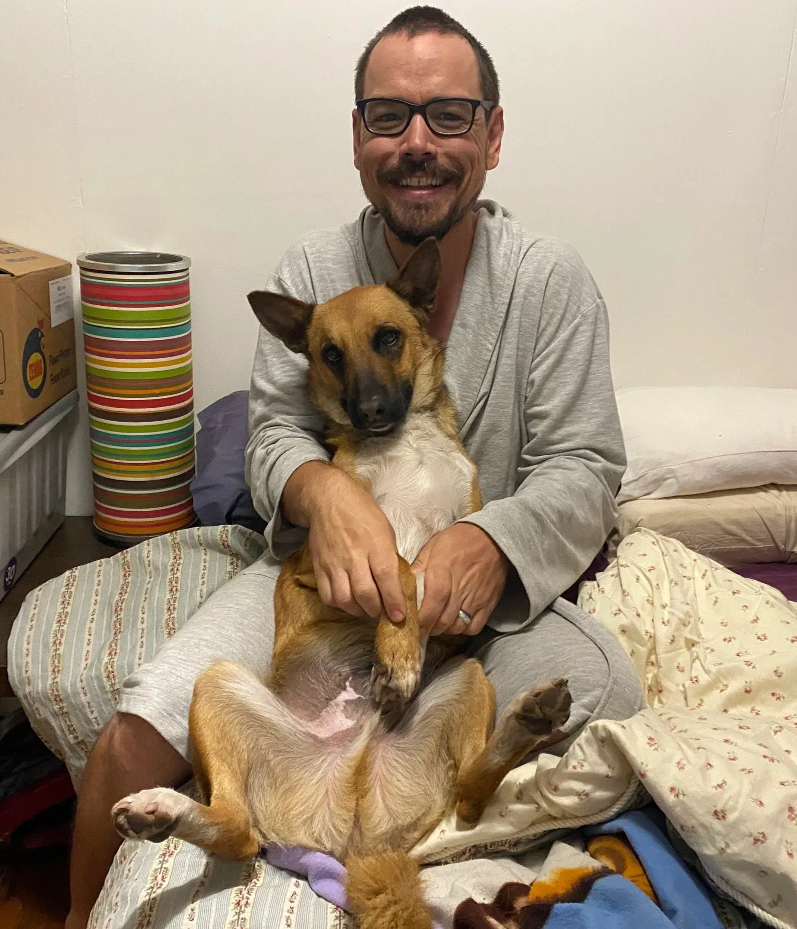 Posing with the puppy on HIS bed…
