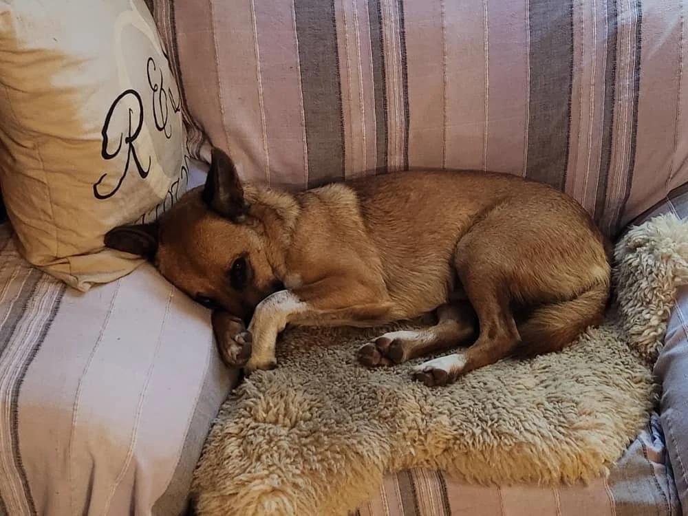 Koda being cute, snuggled on his chair, under the TV, where we can watch him all evening.