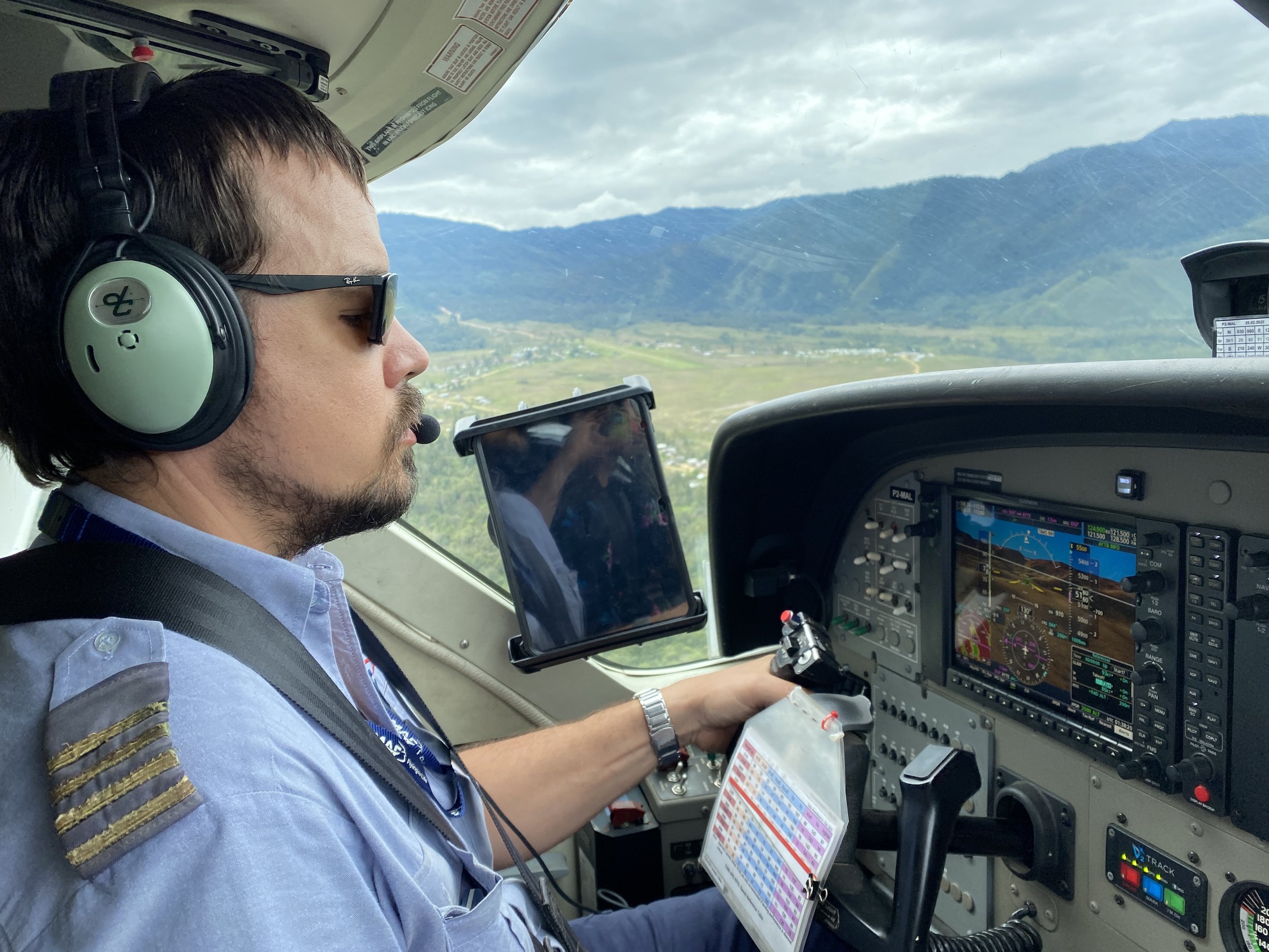 Ryan flying his C208 Caravan, just about to turn to land at Telefomin. You can see the airstrip just above his iPad (Also known as the pilots’ Electronic Flight Bag (EFB)).